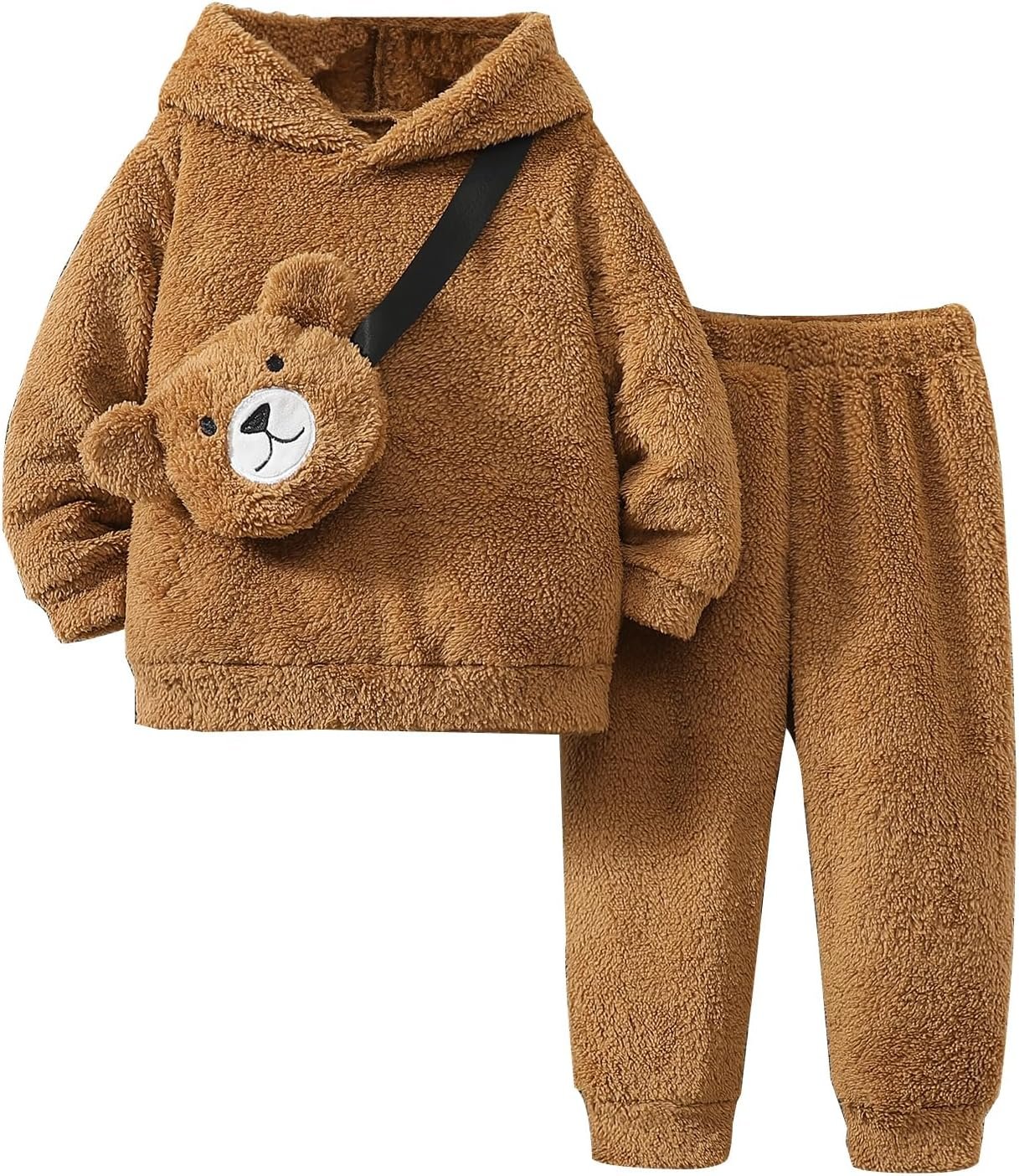 Kids Teddy Fleece Bear Hoodie and Sweatpants 2 Piece Sweatsuit Set Brown